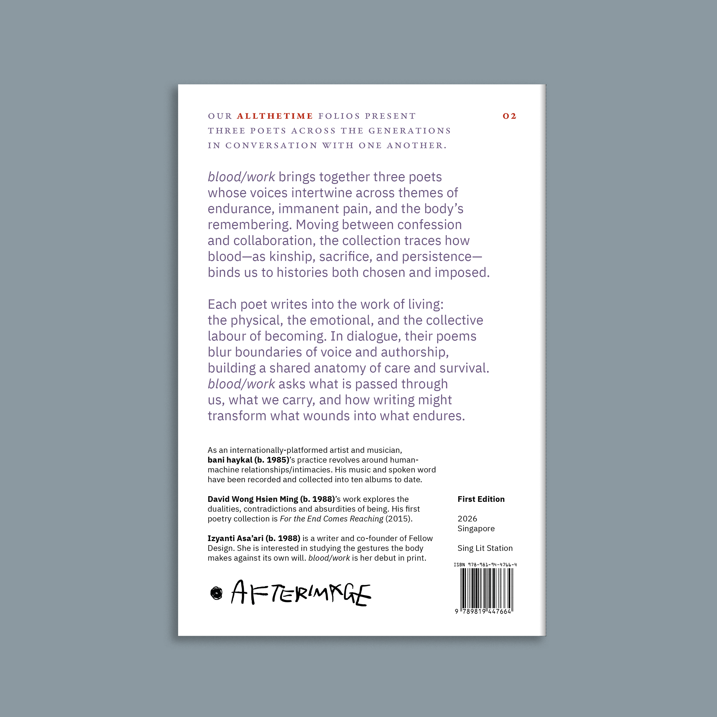 (b. 1988) is a writer and co-founder of Fellow Design. Her works have appeared in anthologies such as This is Not a Safety Barrier (Ethos Books, 2016), to let the light in (Sing Lit Station, 2021), New Singapore Poetries (Gaudy Boy, 2022) and The Opening Act (Layl Ash-Shayr, 2024).